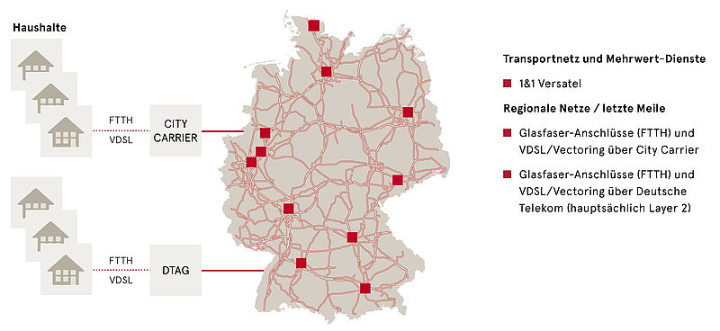 Dabei nutzen wir unser eigenes Glasfasernetz (1&1 Versatel) und erschließen bei VDSL- / Vectoring-Anschlüssen (FTTC = Fiber-to-the-Curb) die „letzte Meile“ hauptsächlich über die BNGs / Layer-2-Infrastruktur der Deutschen Telekom (bzw. Layer-3 außerhalb des eigenen Glasfasernetzes). Bei direkten Glasfaser-Anschlüssen (FTTH = Fibre-to-the-Home) erschließen wir die „letzte Meile“ über FTTH-Hausanschlüsse führender City Carrier sowie der Deutschen Telekom. Beim auslaufenden Geschäft mit ADSL-Anschlüssen nutzen wir weitere Vorleistungsanbieter.